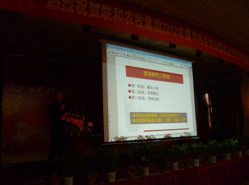 本刊訊 2013年元月17日,聯(lián)和農(nóng)牧集團(tuán)2012年度年終總結(jié)大會(huì)暨表彰大會(huì)在南昌翠林高爾夫酒店隆重召開。在總結(jié)表彰大會(huì)中邀請(qǐng)了清華大學(xué)客座教授、上海輔音國(guó)際首席顧問趙明,以及上海輔音國(guó)際著名培訓(xùn)師王中作客聯(lián)和農(nóng)牧集團(tuán)培訓(xùn)。集團(tuán)總裁王曉林,集團(tuán)各部門總監(jiān)和主管,以及各分子公司總經(jīng)理,優(yōu)秀主管、優(yōu)秀員工、銷售精英代表近300人參加此次培訓(xùn)學(xué)習(xí)。趙教授培訓(xùn)的課題是《如何打造執(zhí)行力》和《產(chǎn)品可以豎著賣》,王中老師培訓(xùn)課題是《步步為贏-營(yíng)銷經(jīng)典三大工具》。
