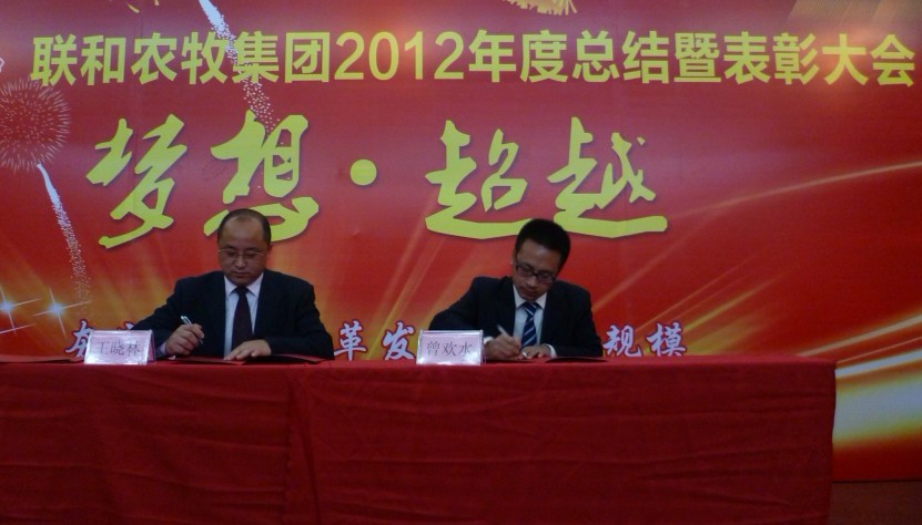 本刊訊 2013年元月18日,聯(lián)和農(nóng)牧集團(tuán)2012年度經(jīng)營總結(jié)表彰大會(huì)在南昌翠林高爾夫酒店隆重召開。在大會(huì)上聯(lián)和農(nóng)牧集團(tuán)總裁王曉林代表集團(tuán)董事會(huì),與聯(lián)和農(nóng)牧集團(tuán)新干聯(lián)和公司總經(jīng)理張琦、泰和聯(lián)和公司總經(jīng)理陳文斌、南昌聯(lián)和實(shí)業(yè)公司總經(jīng)理華志平、南昌聯(lián)和飼料公司總經(jīng)理李建軍、副總胡榮坤,贛州聯(lián)和飼料公司總經(jīng)理翟進(jìn)亮、云南聯(lián)創(chuàng)飼料公司總經(jīng)理曾歡水、云南和美飼料公司總經(jīng)理梁靜、貴州和美飼料公司總經(jīng)理方兵分別簽訂2013年度經(jīng)營責(zé)任書。聯(lián)和農(nóng)牧集團(tuán)總部各部門主管、以及各分子公司優(yōu)秀主管、優(yōu)秀員工和銷售精英代表近300人,見證了這一神圣而莊重的時(shí)刻。