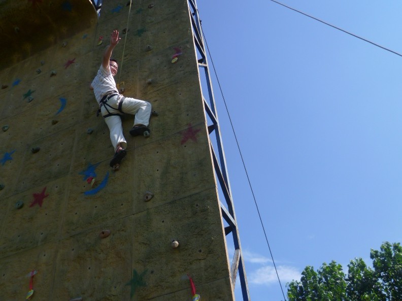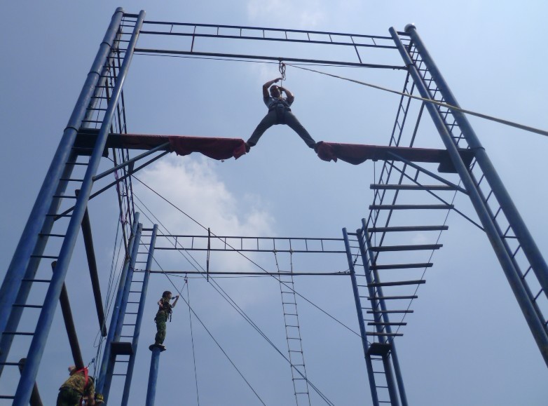 在訓(xùn)練場上,我們忘記了年齡,忘記了工作身份,忘記了生活環(huán)境,我們拋開一切,全身心投入到訓(xùn)練中,我們的團(tuán)隊(duì)有著一個陽光而又響亮的名字—聯(lián)和精英,在教練的帶領(lǐng)下,我們喊著“熔煉團(tuán)隊(duì)”的口號、高唱著“團(tuán)結(jié)就是力量”開始了一天的極具挑戰(zhàn)的訓(xùn)練。整個訓(xùn)練主要包括:團(tuán)隊(duì)接力、智力搶答、無敵風(fēng)火輪、高空斷橋、挑戰(zhàn)大魔王、攀巖、攀登畢業(yè)墻。