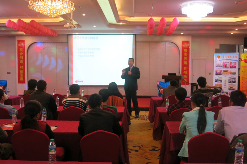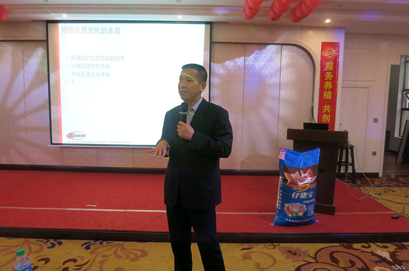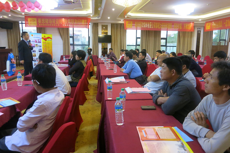上午9點,會議在高昂的音樂聲中隆重開幕,首先主持人邀請?zhí)┖吐?lián)和總經(jīng)理陳文斌上臺致歡迎辭,陳總對各位豬場老板的蒞臨表示熱烈的歡迎及衷心的感謝,并分析了目前的養(yǎng)殖行業(yè)情況。隨后,由劉立茂老師為大家講解關(guān)于豬場管理方面的內(nèi)容,劉老師以豐富的實戰(zhàn)經(jīng)驗講到了豬場的一些注意細節(jié)及管理方法,贏得了各位老板的陣陣掌聲。之后,由集團產(chǎn)品總監(jiān)劉情為大家分享講解關(guān)于聯(lián)和新產(chǎn)品--仔豬寶的品質(zhì)管理及飼喂方面的內(nèi)容,豬場老板對聯(lián)和仔豬寶的使用效果表示認可。隨后,由來自吉安的王老板、周老板以及吉水的黃老板等豬場代表上臺與大家一起分享了使用聯(lián)和飼料的感受,三位老板紛紛表示自己使用聯(lián)和幾年來,感覺聯(lián)和飼料產(chǎn)品質(zhì)量穩(wěn)定、性價比很高,特別是仔豬寶產(chǎn)品,使用效果非常好,并表示聯(lián)和服務到位。