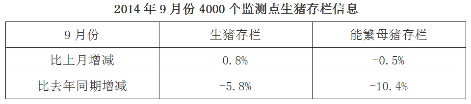 10月15日農(nóng)業(yè)部發(fā)布了2014年9月份4000個(gè)監(jiān)測點(diǎn)的生豬存欄信息,數(shù)據(jù)顯示,9月全國生豬存欄量比上月增加0.8%,比去年同期減少5.8%;能繁母豬存欄量比上月減少0.5%,比去年同期減少10.4%。